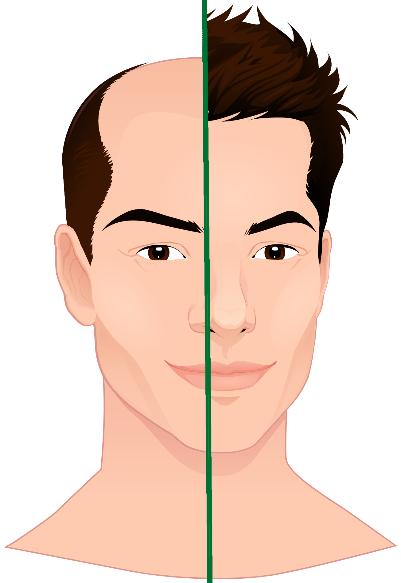 Die androgenetischer Haarausfall tritt in verschiedenen Verlaufsformen in Erscheinung. Am häufigsten sind die sog. Geheimratsecken im Bereich der Schläfen. Im Zeitverlauf kann sich der Haarausfall ausweiten und zu einer Glatze oder einem Haarkranz führen.